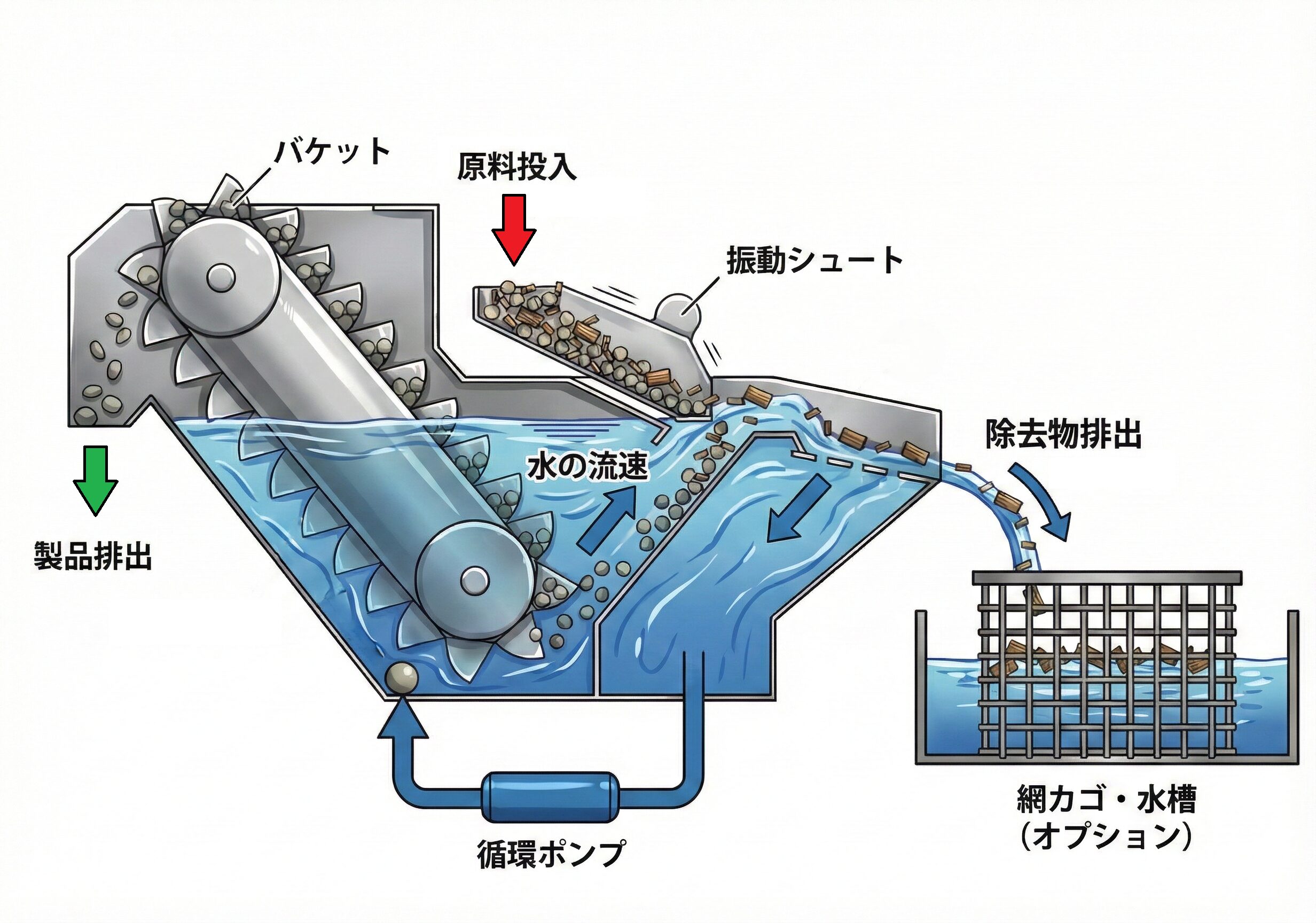 選別部では水流と比重差を利用し、重い砂利を落下させ、浮遊した除去物を水と共に排出します。