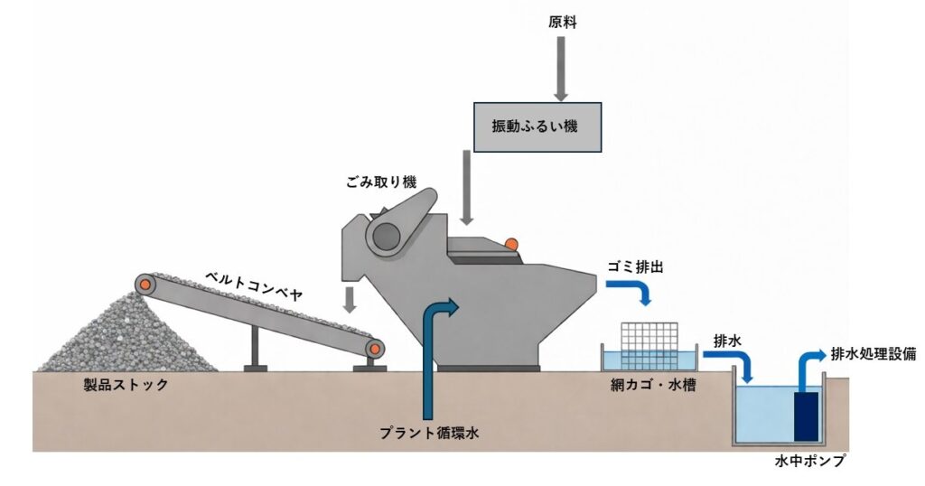 従来は、振動ふるい機で選別された砂利をそのままベルトコンベヤでストックヤードへ搬送していましたが、今回、ふるい機とコンベヤの間に当社製「ごみ取り機」を組み込むレイアウトをご提案いたしました。