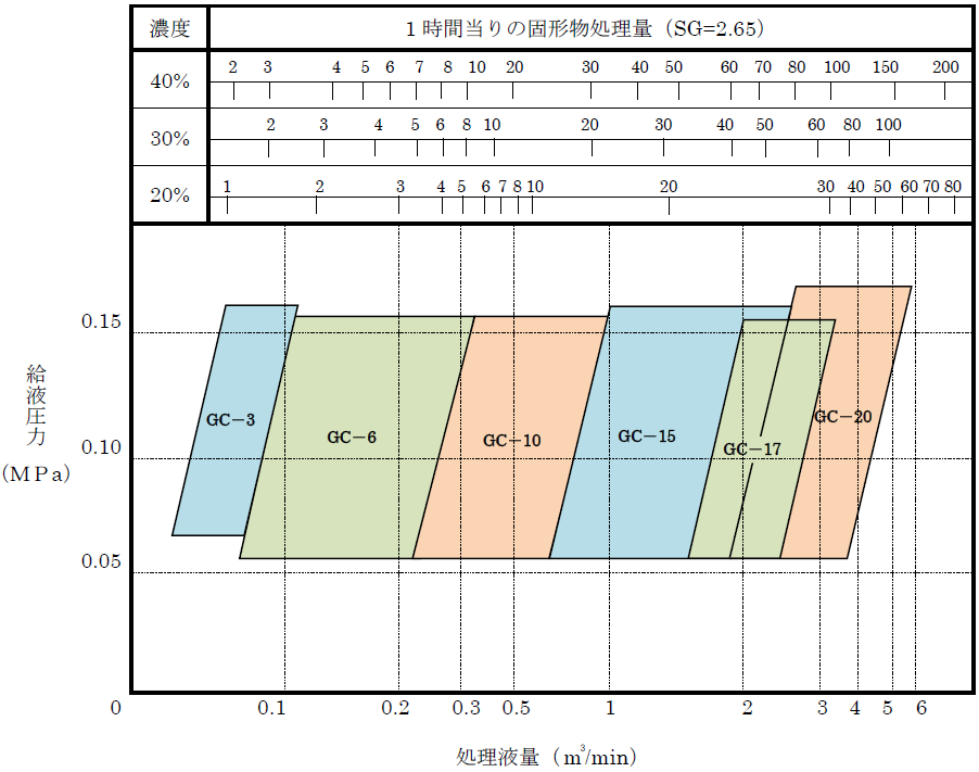 | 処理液量(㎥/min) | 0.06~0.1 | 0.09~0.3 | 0.25~0.9 | 0.8~2.2 | 1.6~3.0 | 2.5~5.0 |