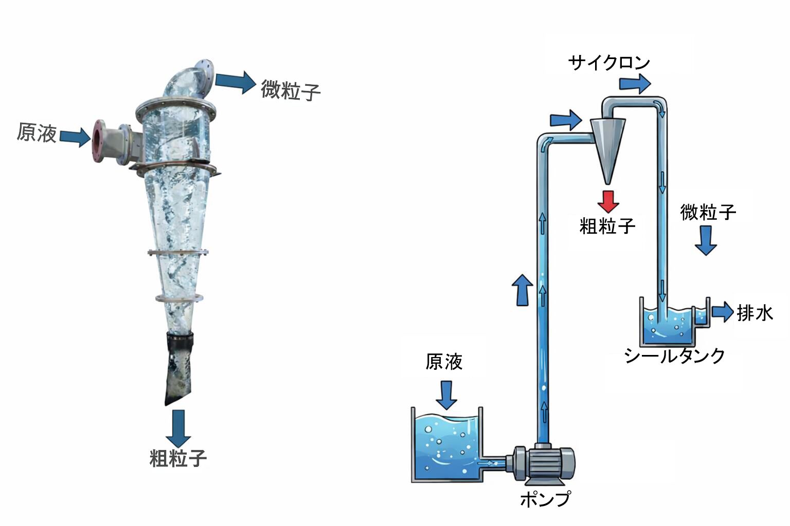 サイクロンに圧送された原液は、内部で発生する強い遠心力によって分離されます。重い粗粒子は周壁部に集まり、旋回しながら下方へ沈降・排出される一方、軽い微粒子は中心部に引き寄せられ、オーバーフロー部から排出されます。