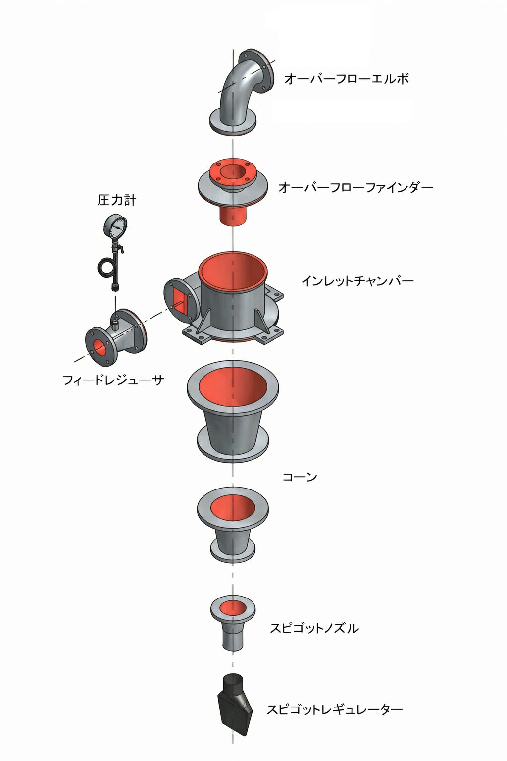 本体を高所に設置することでオーバーフロー配管内にサイフォン効果が生じ、サイクロン内部は常に負圧に保たれます。分級された粗粒子はスピゴットレギュレーター内部に堆積し、その重量が負圧(弁を閉じる力)を上回った瞬間にのみ排出される仕組みです。